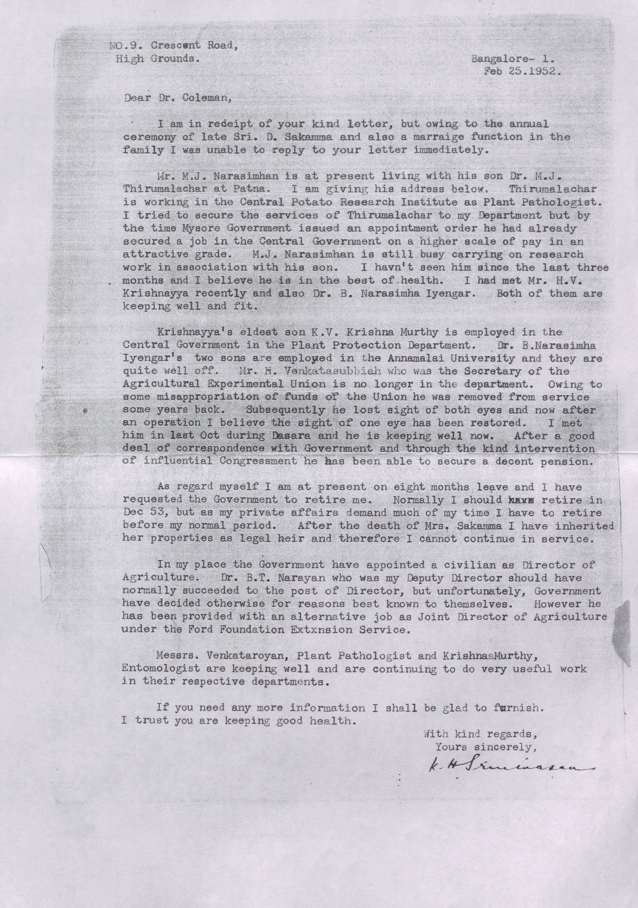 Copy of a letter from K. H. Srinivasan to Leslie Coleman, dated 25th February, 1952. Discussing whereabouts of mutual acquaintances from Mysore Agricultural Department.