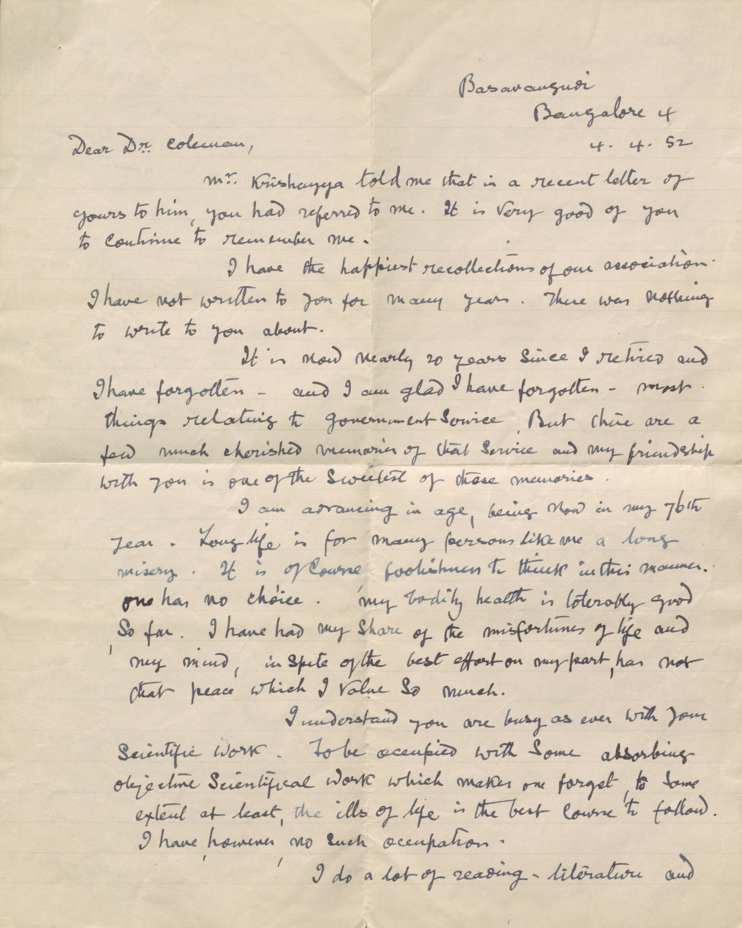 From M. B. Krishna Rao to Leslie Coleman, dated 4th April, 1952. Pleasantries and reminiscences about the time spent together in India.