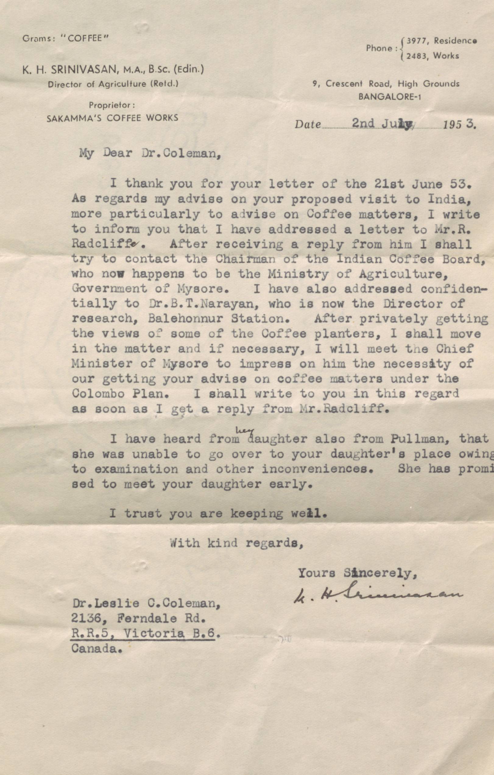 Concerning Coleman's planned visit to India to advise on 'Coffee matters'.