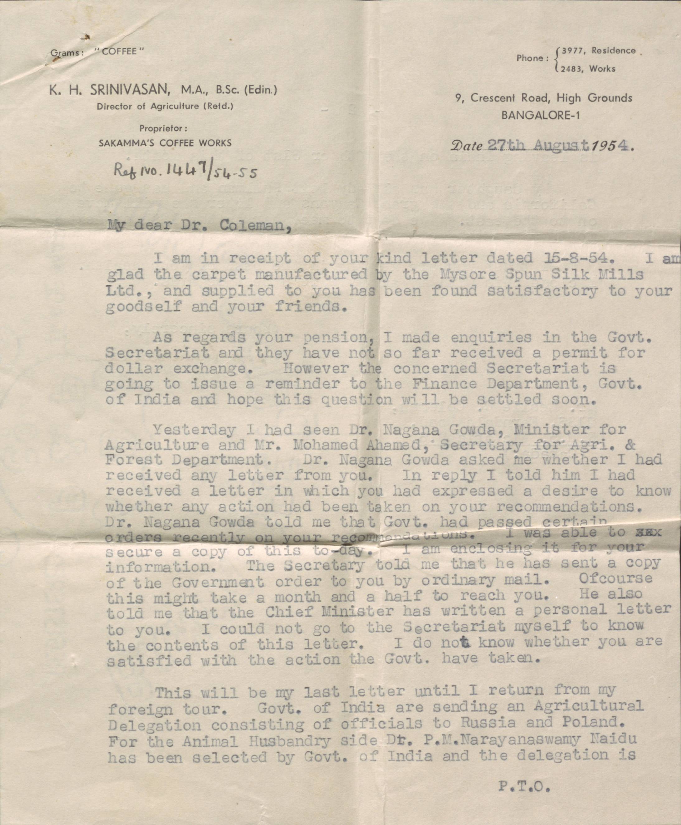 Discusses Coleman's visit to Mysore State. Includes Coleman's recommendations regarding the Agricultural Department in Mysore State.
