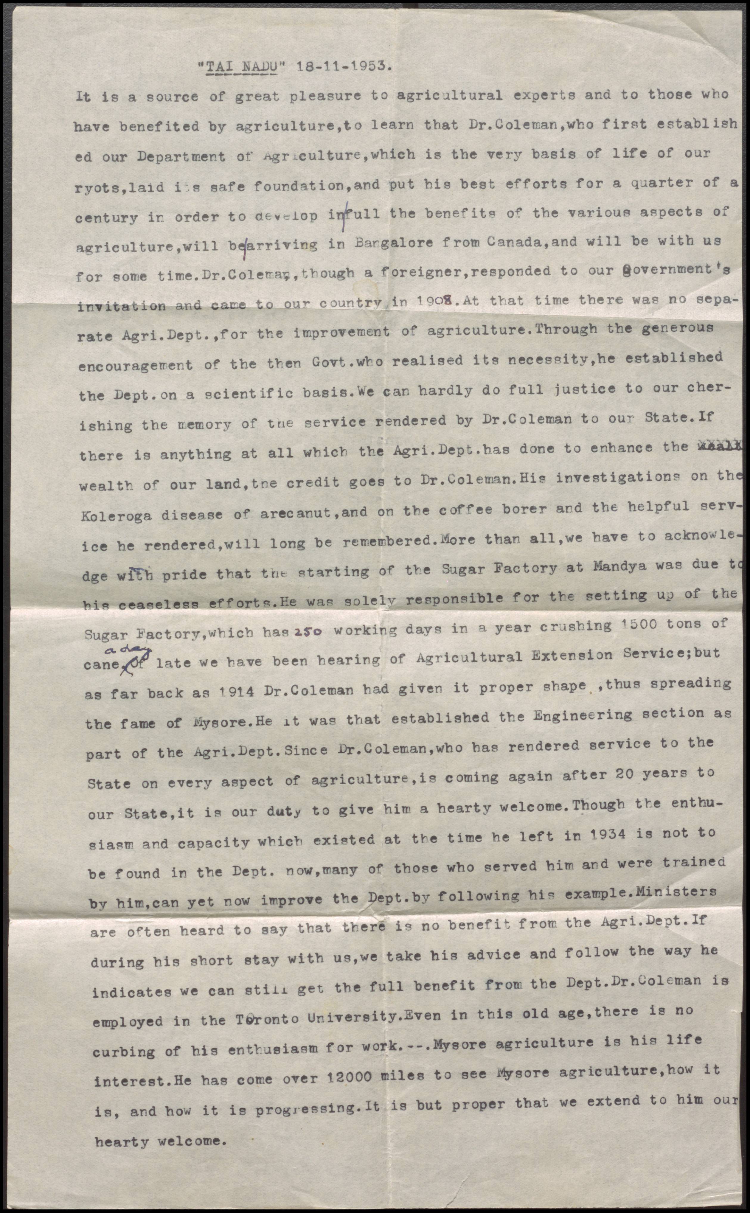 Titled 'Tai Nadu' (Motherland). Welcomes Coleman back to Mysore state and details his achievements during his service in India.