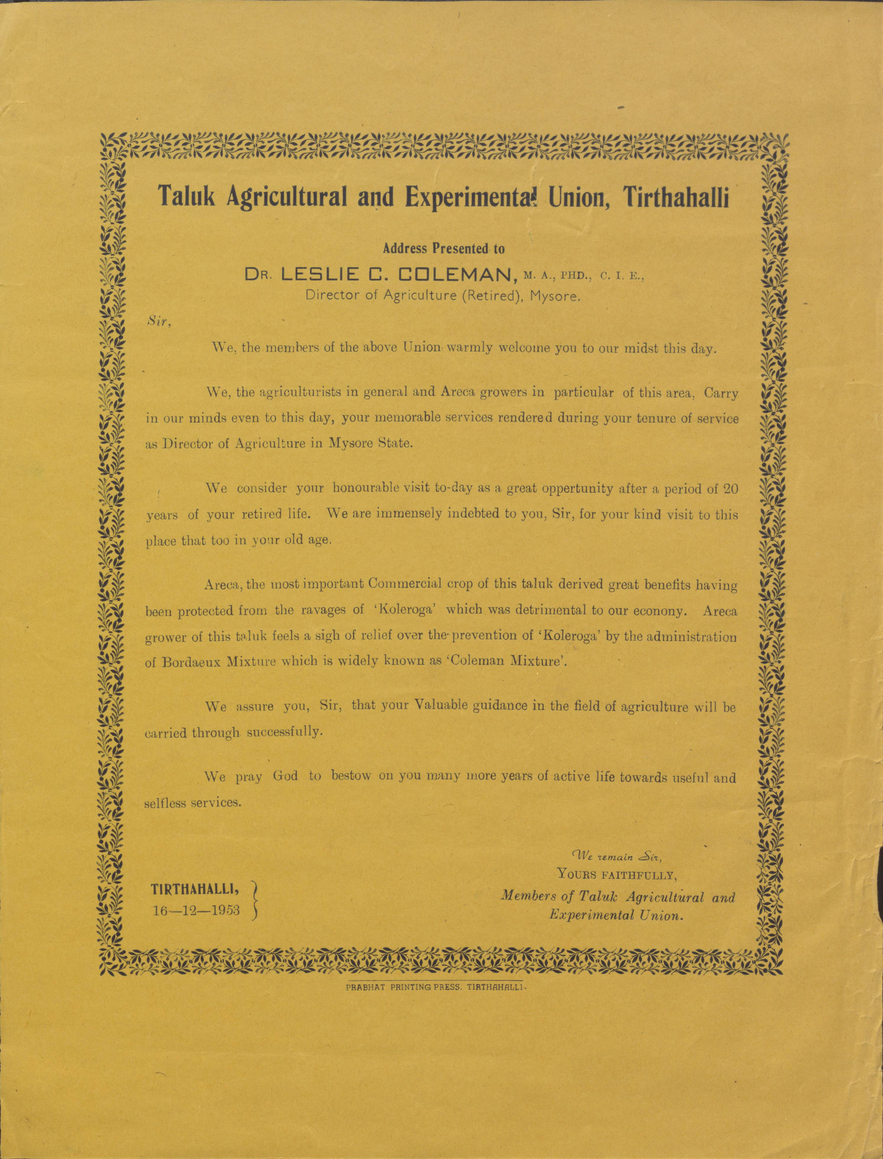 Taluk Agricultural and Experimental Union, Thirthahalli, 16 December 1953
