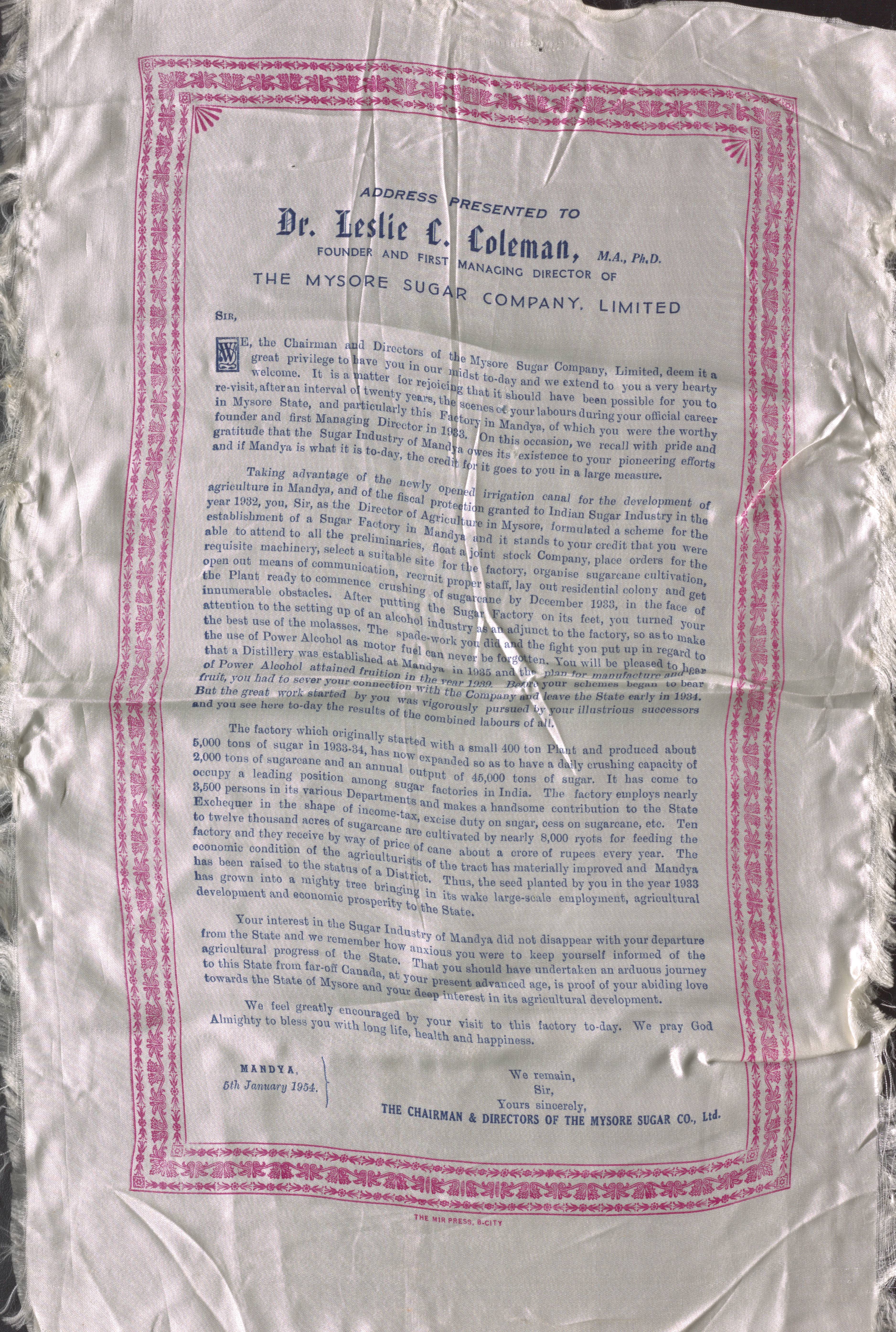 Mysore Sugar Company Limited, Mandya, 5 January 1954