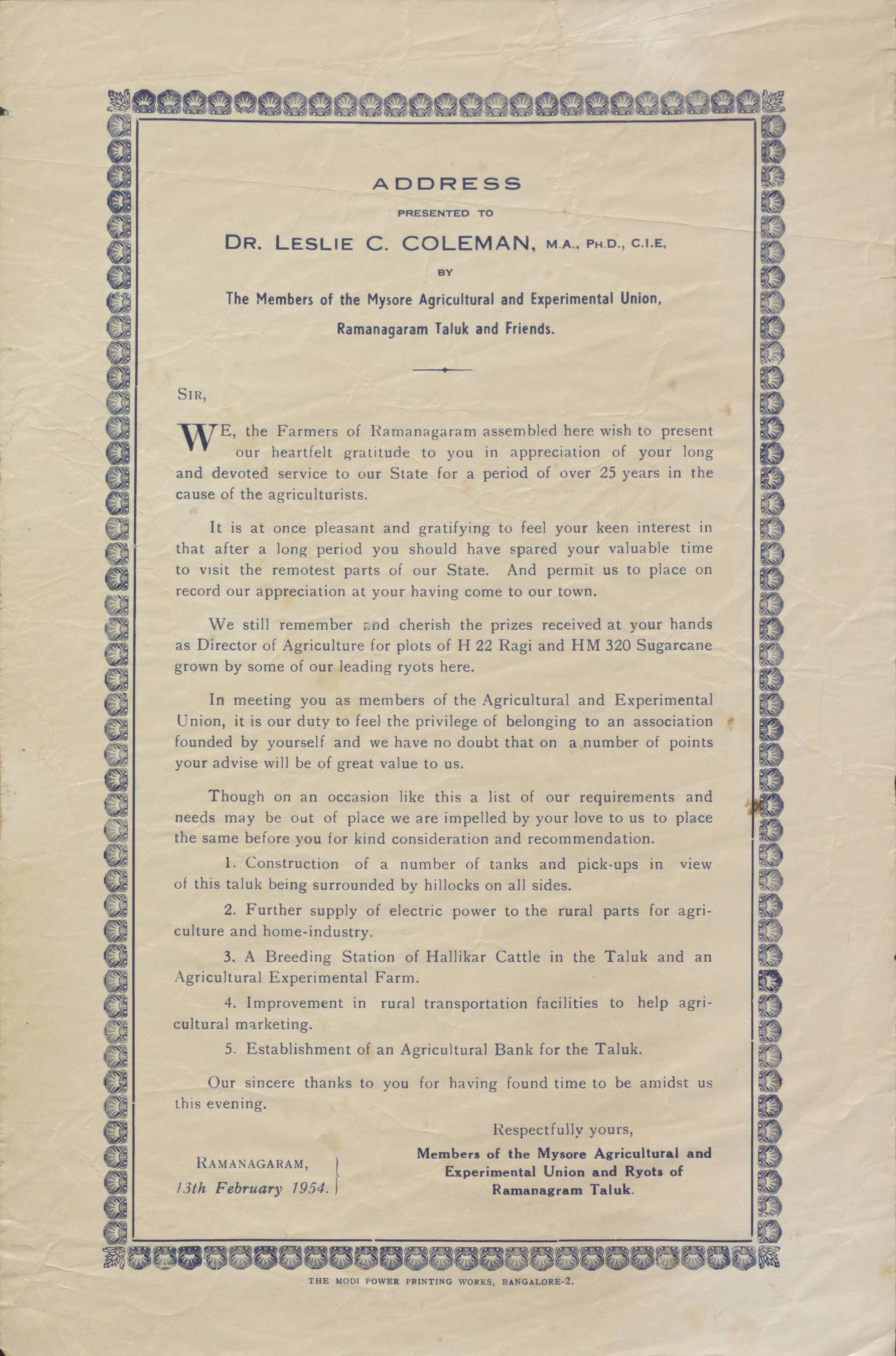 Mysore Agricultural and Experimental Union Ryots of Ramanagaram Taluk, 13 February 1954