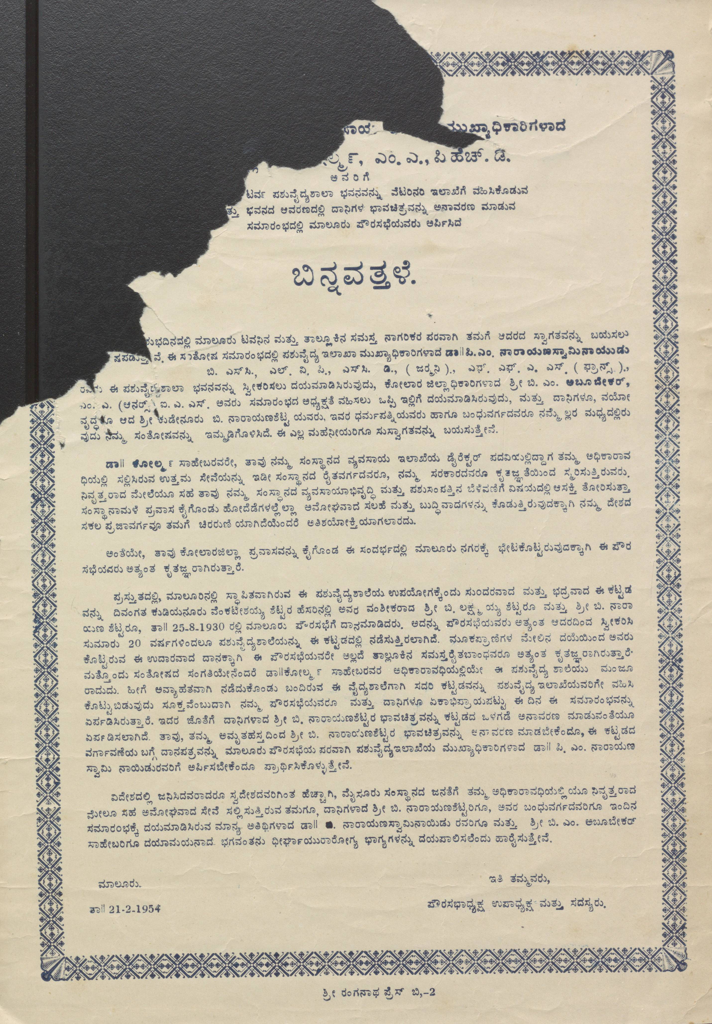 Mentions cattle veterinary centre in Malur town. Includes names of dignitaries present at the event and unveiling of the donor's statue at the veterinary centre.