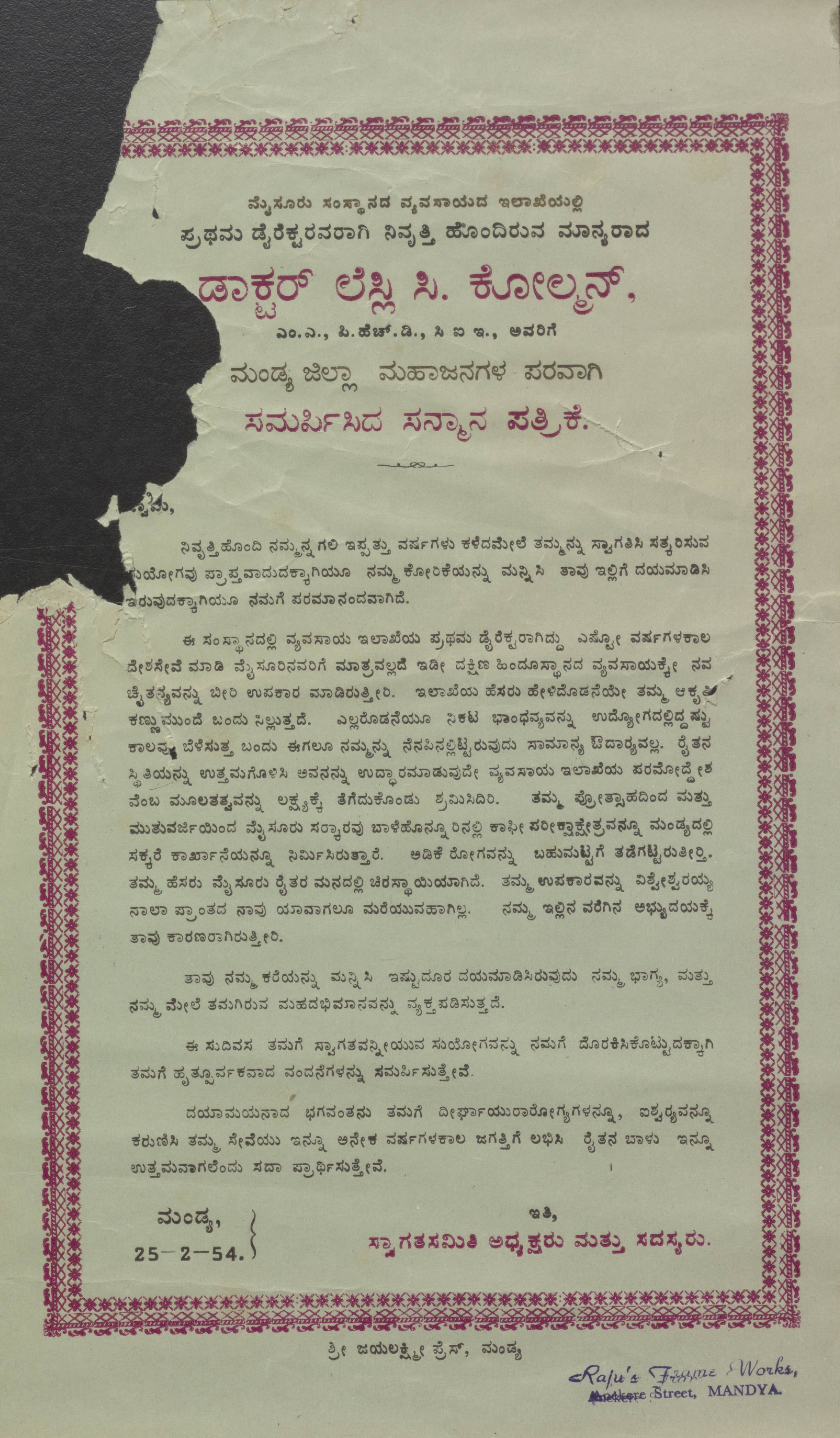 Mentions Coleman's contribution in setting up of Coffee Research Station at Balehonnur and Visvesvaraya canal in Mandya.
