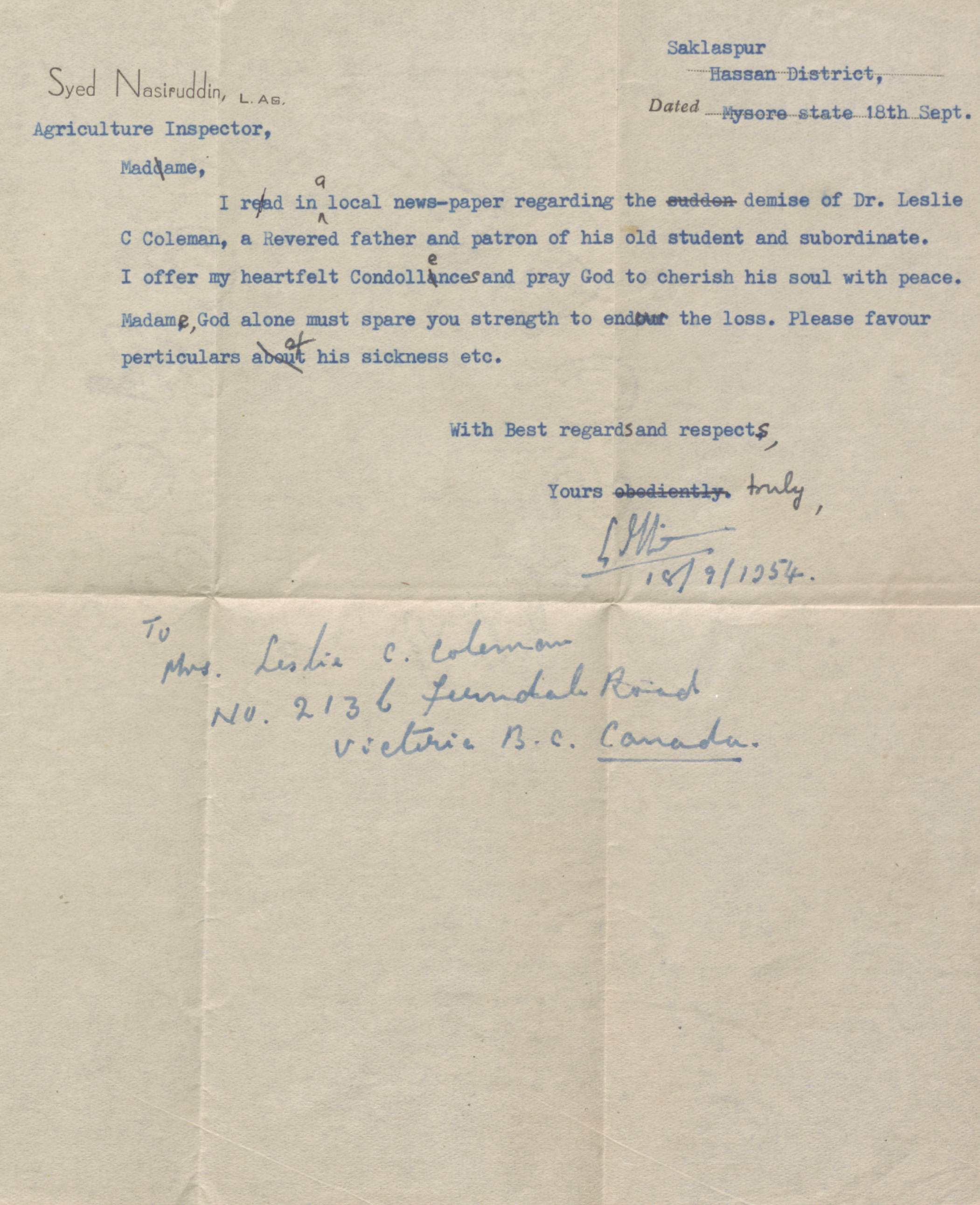 From Syed Nasiruddin, Agricultural Inspector, Saklaspur, Hassan District. Offers condolences to Coleman family.