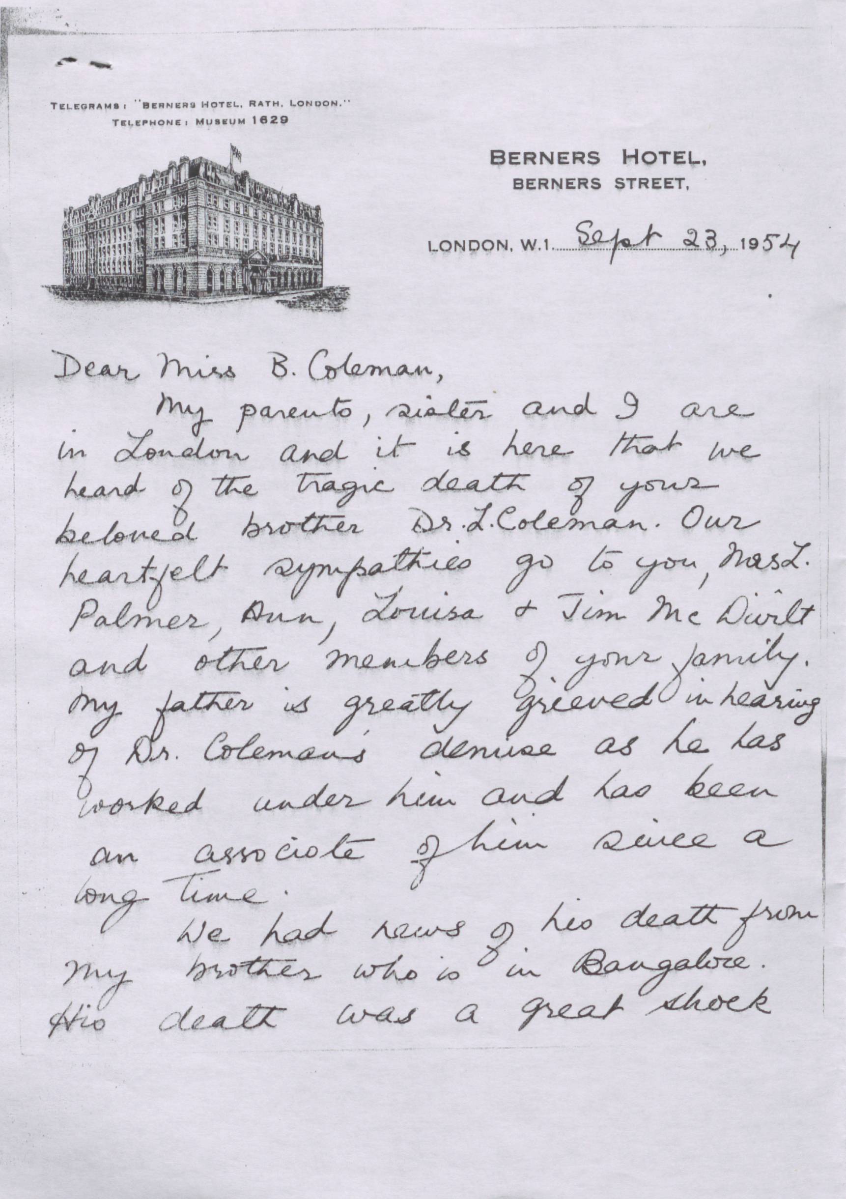 Leila Srinivasan - Bertha Coleman, 23 September 1954