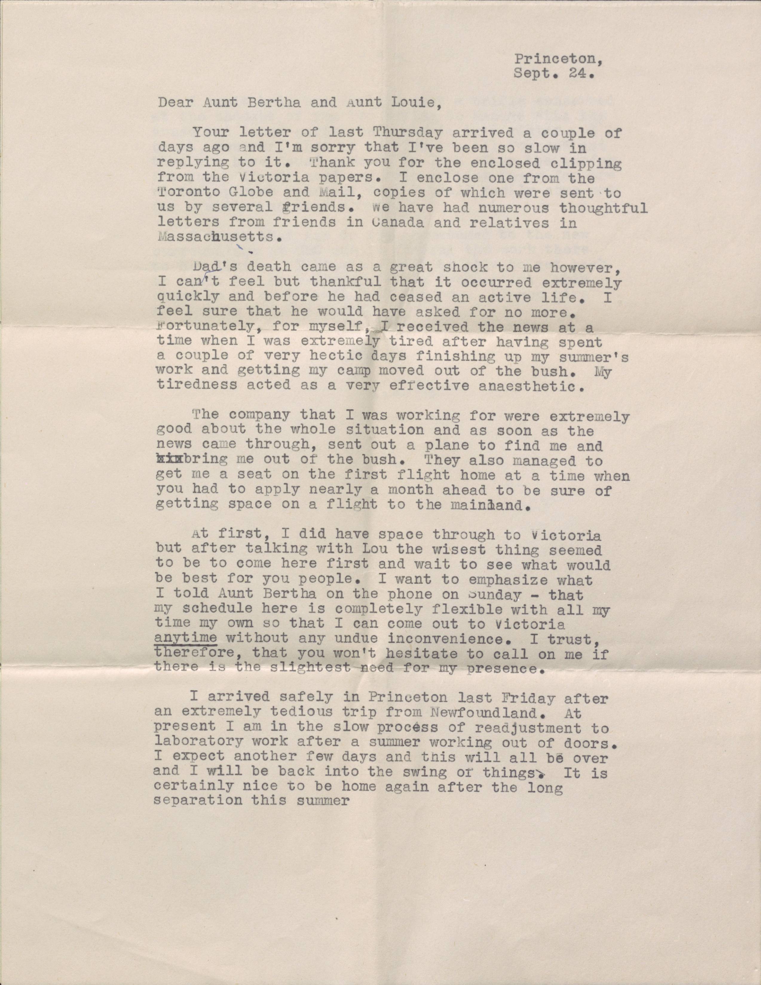 Letter from Leslie Coleman Jr to his family. Details his trip to family home after the sudden death of Coleman.
