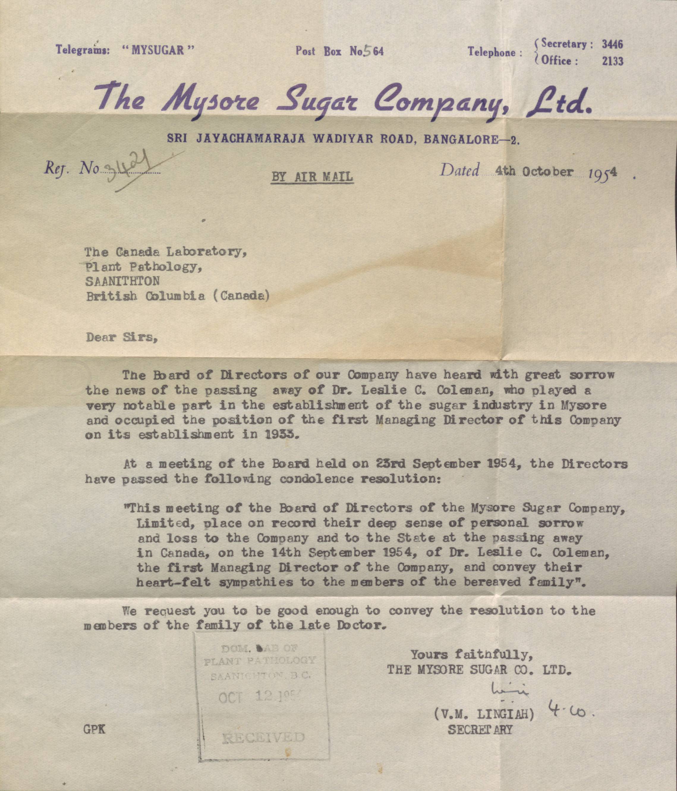 Offers condolences to Coleman family on behalf of Mysore Sugar Company from V. M. Lingiah. Mentions condolence resolution passed by the Board of Directors.
