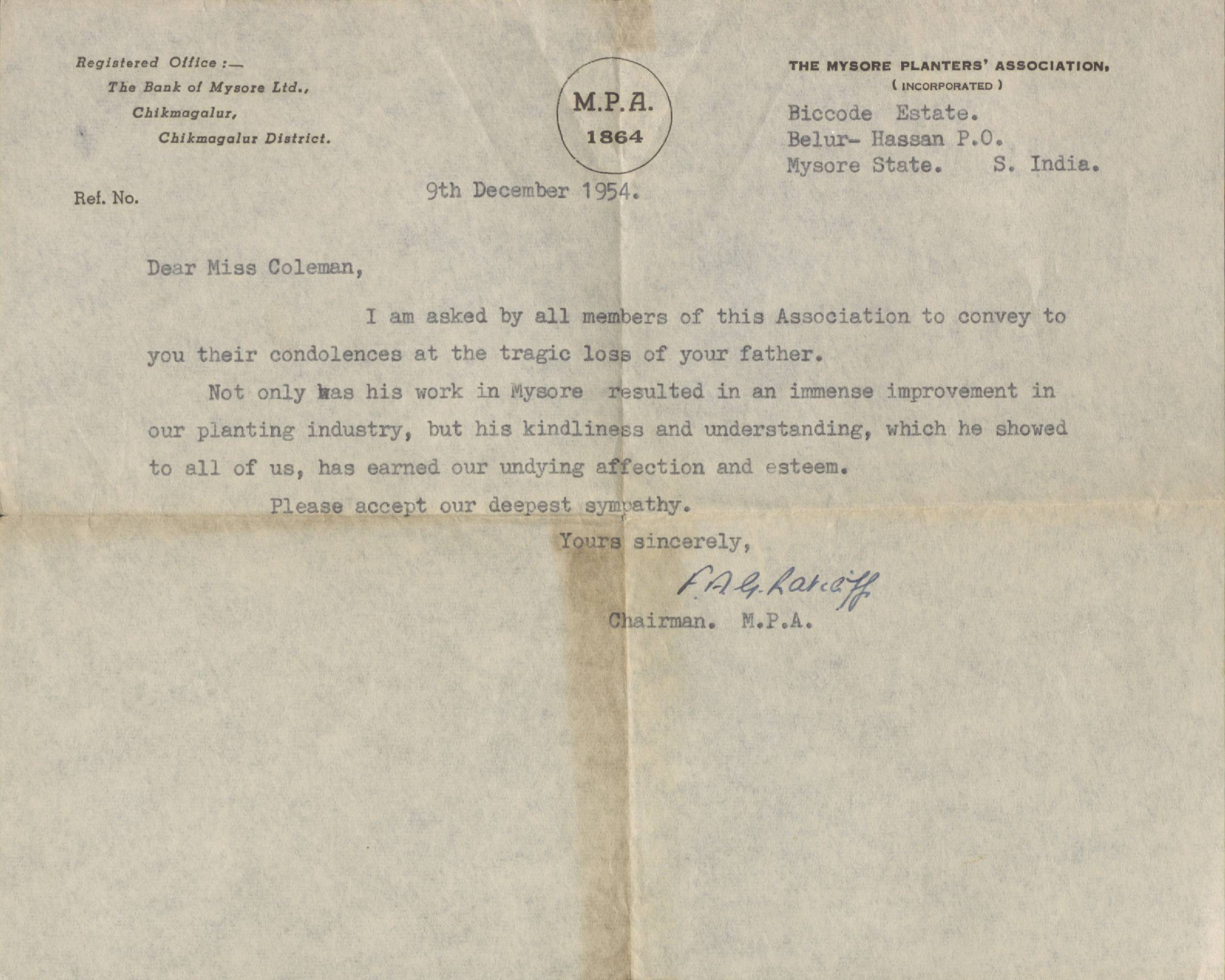 FAG Ratcliff (Mysore Planters Association) - Ms. Coleman, 9 December 1954