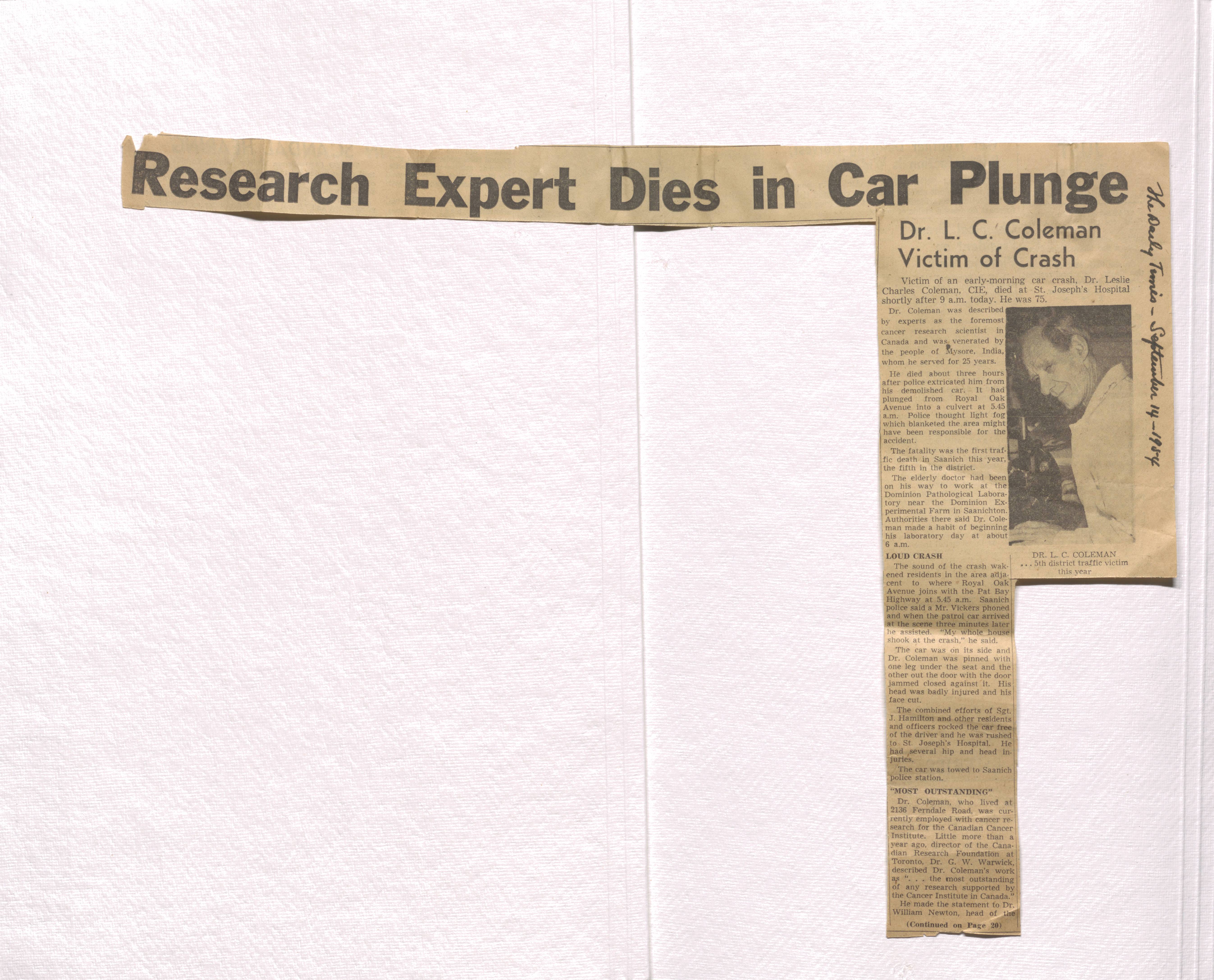 Mentions details about the car crash and Coleman's work at the Canadian Cancer Institute.