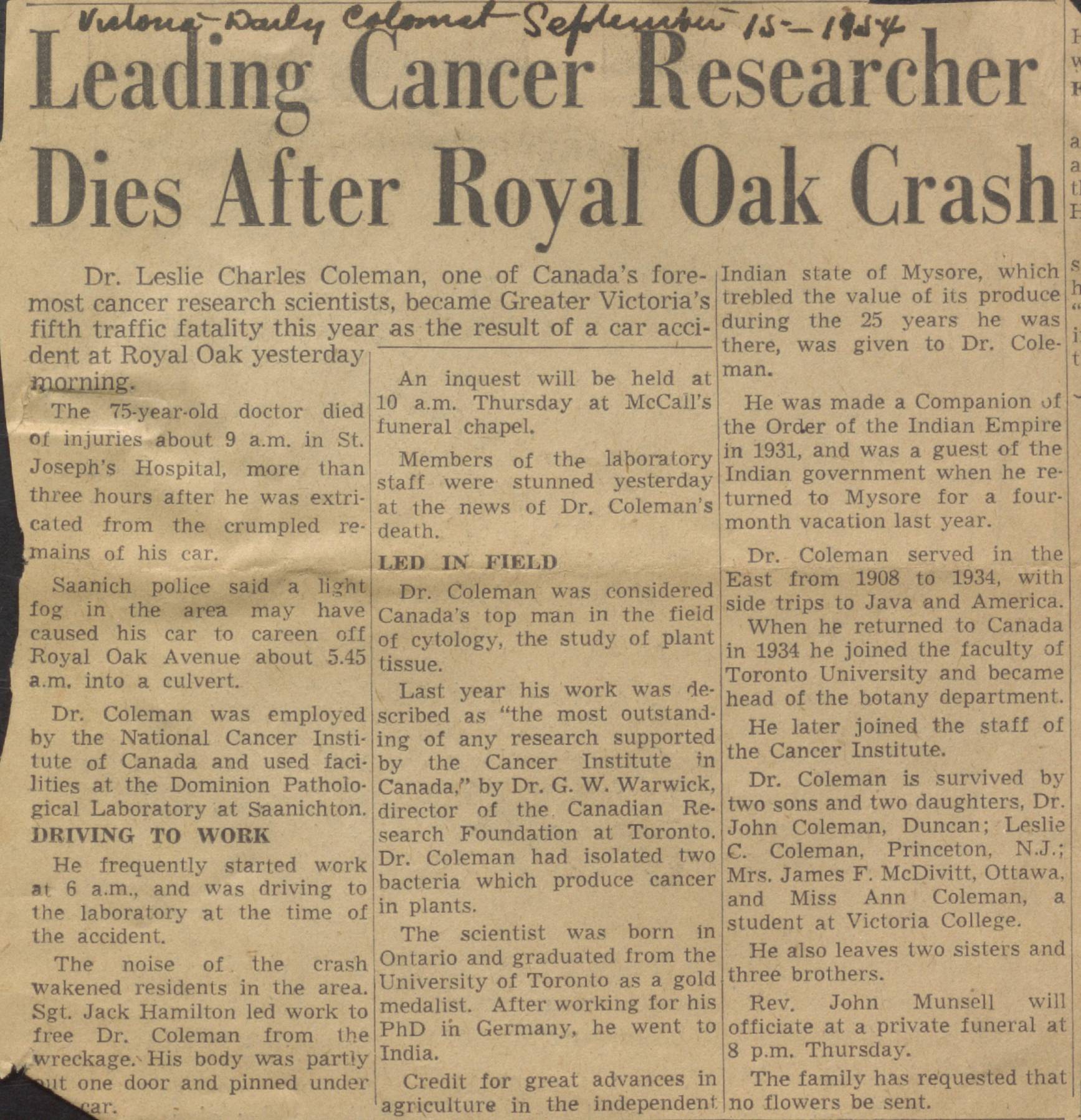 Leading cancer researcher dies after Royal Oak crash- The Daily Colonial, 15 September 1954