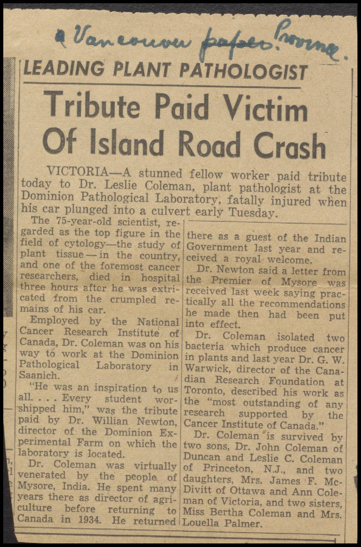 Tributes to Coleman's by his colleague Dr. William Newton, director of the Dominion Experimental Farm in Saanichton.