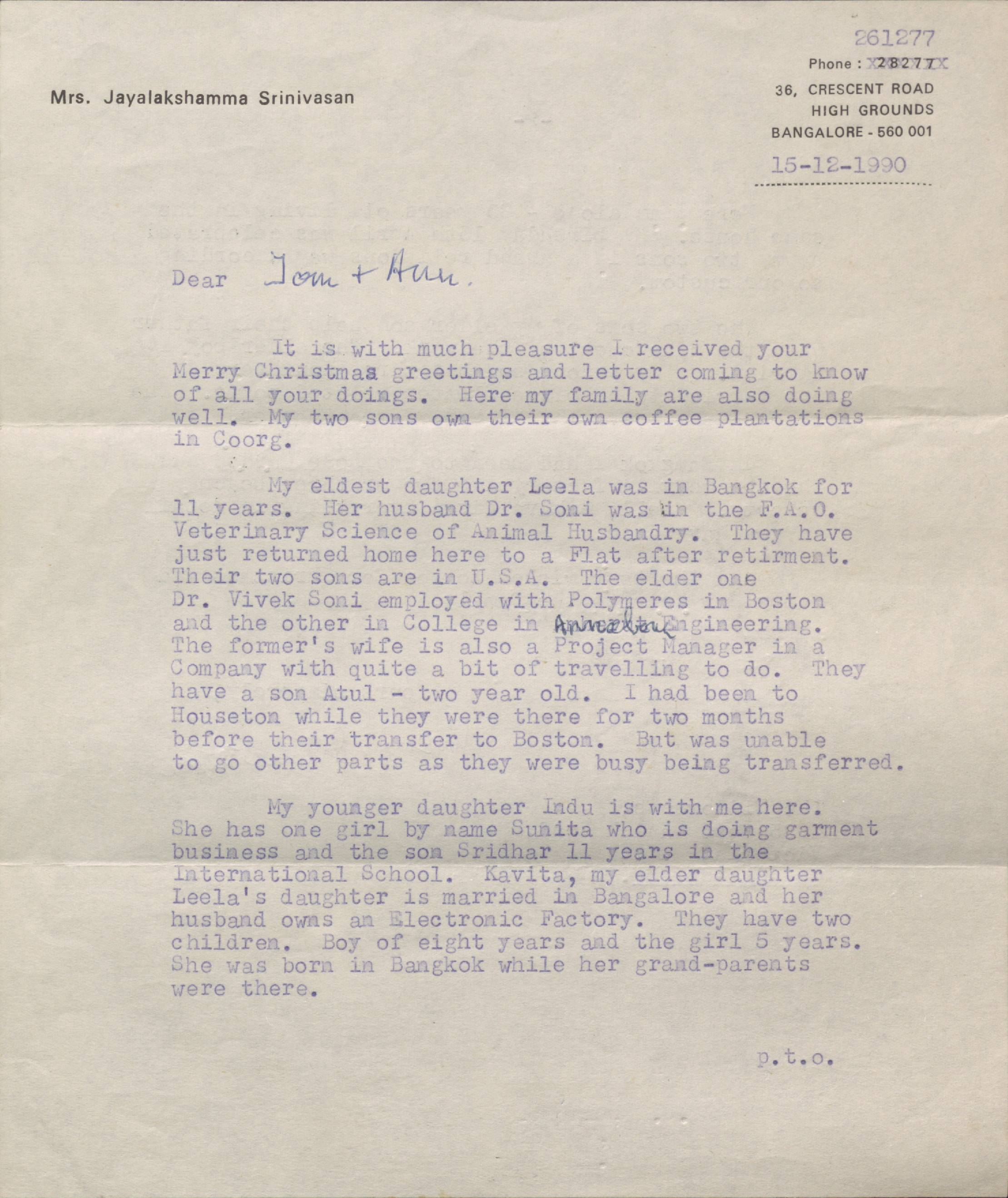 Srinivasan, Jayalakshamma - Tom and Ann Widdowson, 15 December 1990