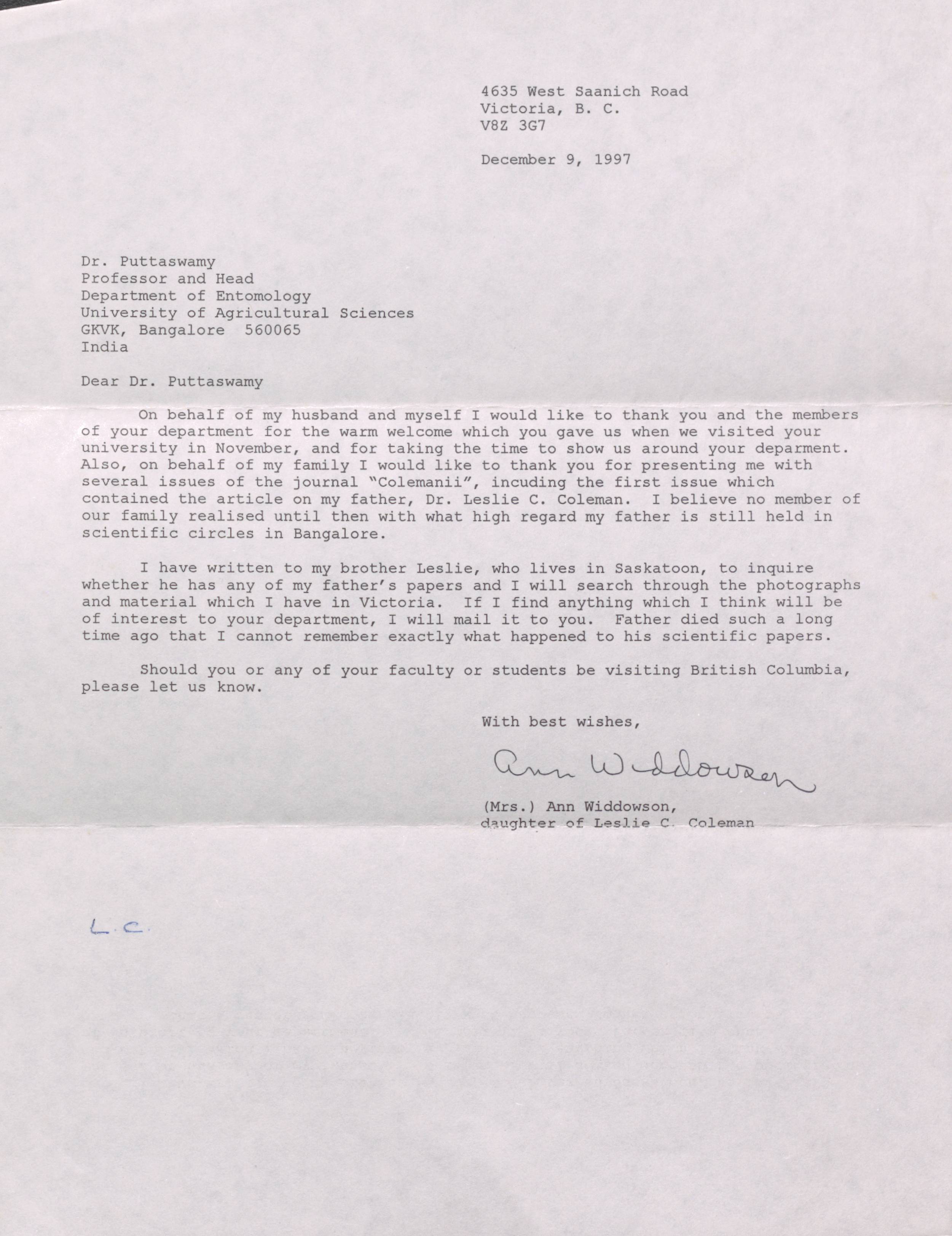 Mentions 'Colemanii' a magazine published by Department of Entomology, University of Agricultural Sciences, GKVK. Includes references to compiling Coleman's scientific papers and sending them to Puttuswamy. Attached are two photo-greeting cards